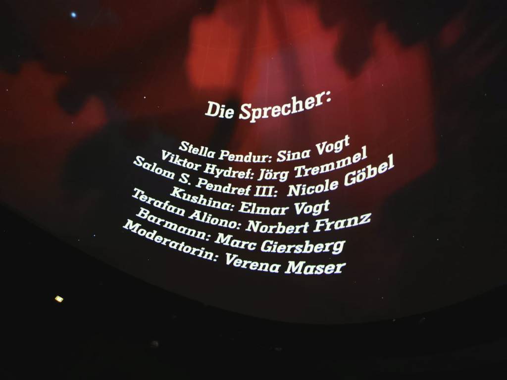 Das heißt, es wird keine zweiten Takes und Wiederholungen und keinen minutiösen Schnitt in der Post-Production geben, sondern nur eine Chance, eine Aufführung, in der ihr auf einer kleinen Bühne steht und eure Texte vortragt, während im Hintergrund die Geräuschkulisse eingespielt wird — alles Auge in Auge (und nicht nur Ohr in Ohr) mit unserem Publikum, unter der Kuppel des Planetariums. Unterlegt wird das Hörspiel mit an die Kuppel projizierten Grafiken.